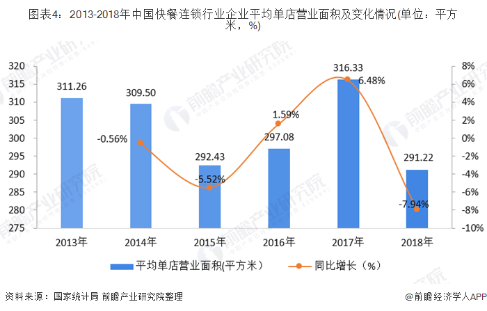 2013-2018年,快餐连锁企业平均单店营业面积(年末餐厅营业面积/门店总数)呈波动下降趋势。2017年达到最大值,为316.33平方米,同比增长6.48%。2018年,营业面积为291.22平方米,同比下降7.94%,为近年来最大降幅。