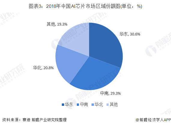 从区域结构上看,2018年我国华北、华东和中南地区稳居AI芯片区域市场三甲。市场份额分别达到20.8%、30.6%和29.3%。在市场增速方面,随着大数据中心在西部地区加快投入建设,西南、西北地区云端AI芯片市场规模呈现高速增长,市场份额进一步提升。