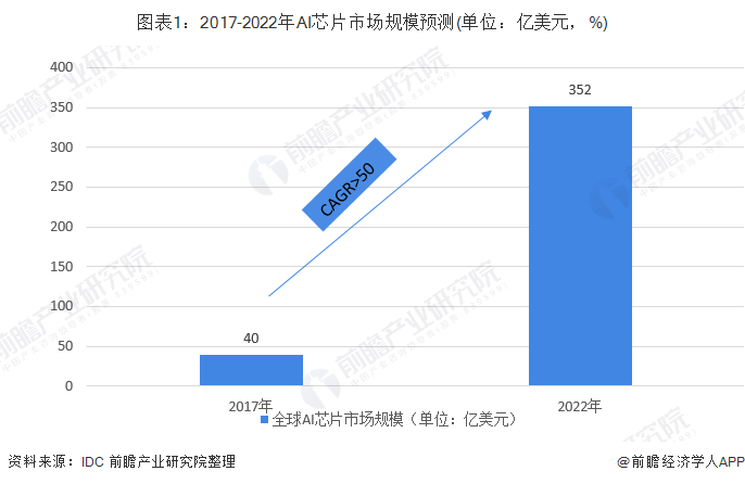 根据IDC数据显示,2017年,整体AI芯片市场规模达到40亿美元,到2022年,整体AI芯片市场规模将会达到352亿美元,CAGR大于55%。