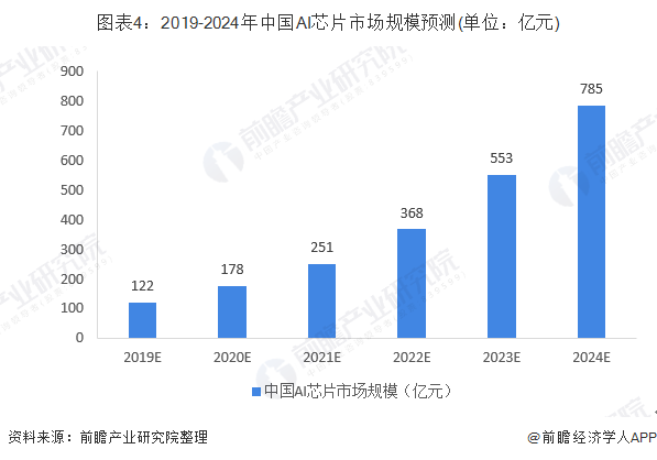 受宏观政策环境、技术进步与升级、人工智能应用普及等众多利好因素的影响,中国AI芯片市场将进一步发展成熟。预计未来几年内,中国芯片市场规模将保持40%-50%的增长速度,2024年,市场将达785亿。