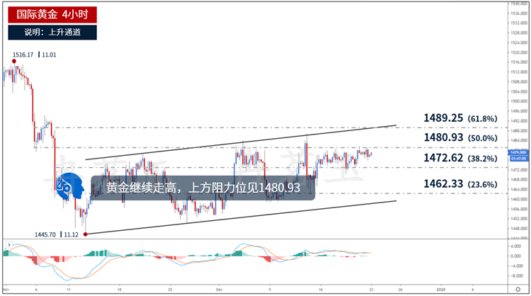 黄金4小时走势,价格继续走高,上方阻力见1480.93若价格继续上行,上方阻力见斐波那契50.0%回调位1480.93,进一步阻力见斐波那契61.8%回调位1489.25。若价格下行,下方支撑位见斐波那契38.2%回调位1472.62,进一步支撑位见斐波那契23.6%回调位1462.33。MACD趋于平缓,上行趋势依旧,可能继续走高至通道上轨1490.(跌破通道下轨失效)