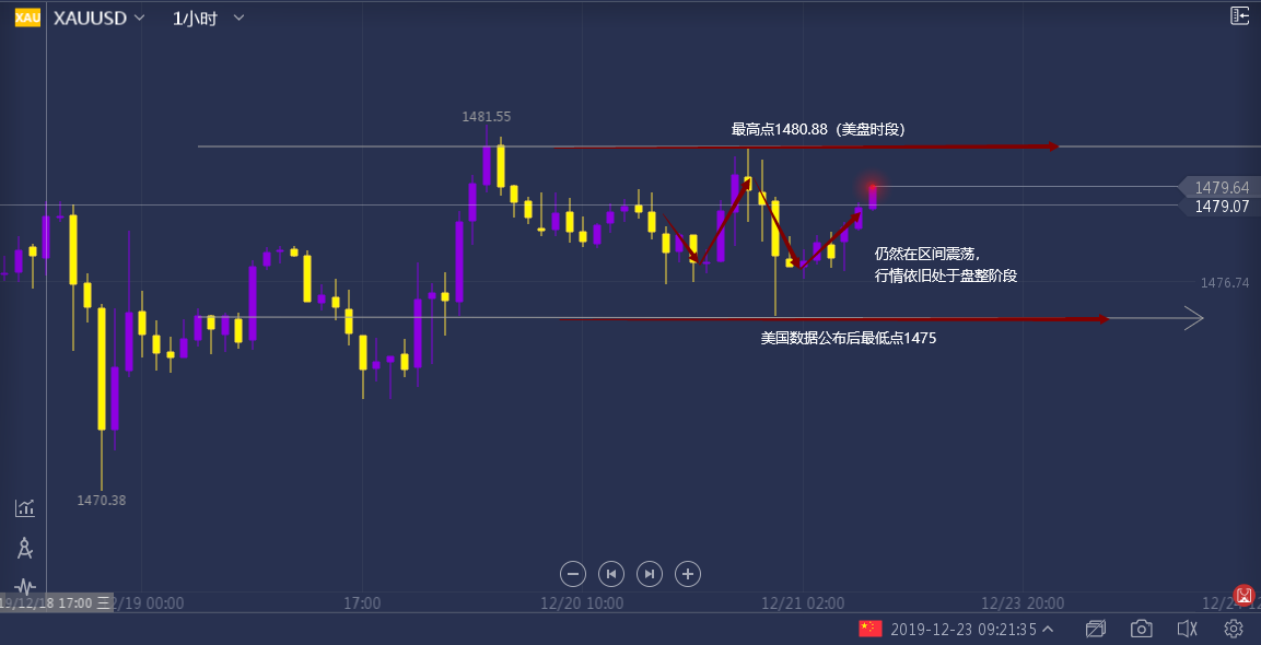 周五行情收取了以一根阴线,亚盘开盘点位即在1478,此后反复震荡,欧盘开盘后依旧延续震荡趋势,美盘开盘后开始冲击高点 数据公布后冲击到1480承压回落至1476