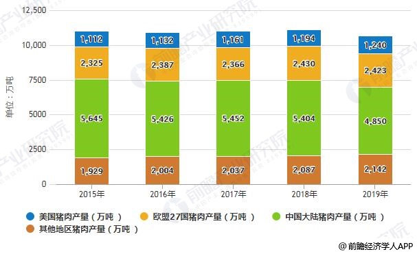 2015-2019年全球主要国家地区猪肉产量统计情况及预测