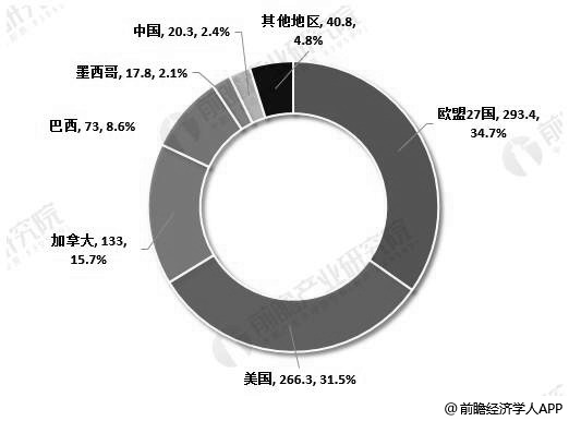 2018年全球猪肉出口量区域分布情况(单位:万吨、%)