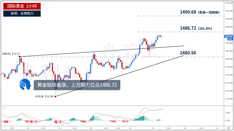 黄金1小时走势,价格突破楔形上轨,短线继续看涨。若价格继续上行,上方阻力见斐波那契161.8%扩展位1486.72,进一步阻力见楔形一倍目标1490.68。若价格下行,下方支撑位见楔形上轨,进一步支撑位见楔形起点1480.56。MACD小幅走高,价格发出形态破位看涨信号,可能继续走高至前高1490.(跌破1480失效)