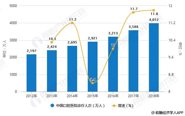 中国口腔医院诊疗人次也逐年增多,且增长率均在11%左右,2018年诊疗人次共4012万人次,同比增长11.8%。