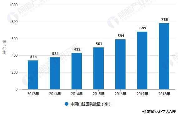 近年来,我国口腔医院数量总体上保持增长趋势。根据国家卫生健康委员会数据,截至2018年底,中国口腔医院数量为786家,同比2017年增加97家。