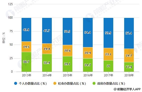 2013-2018年中国口腔医院按主办单位类型占比统计情况