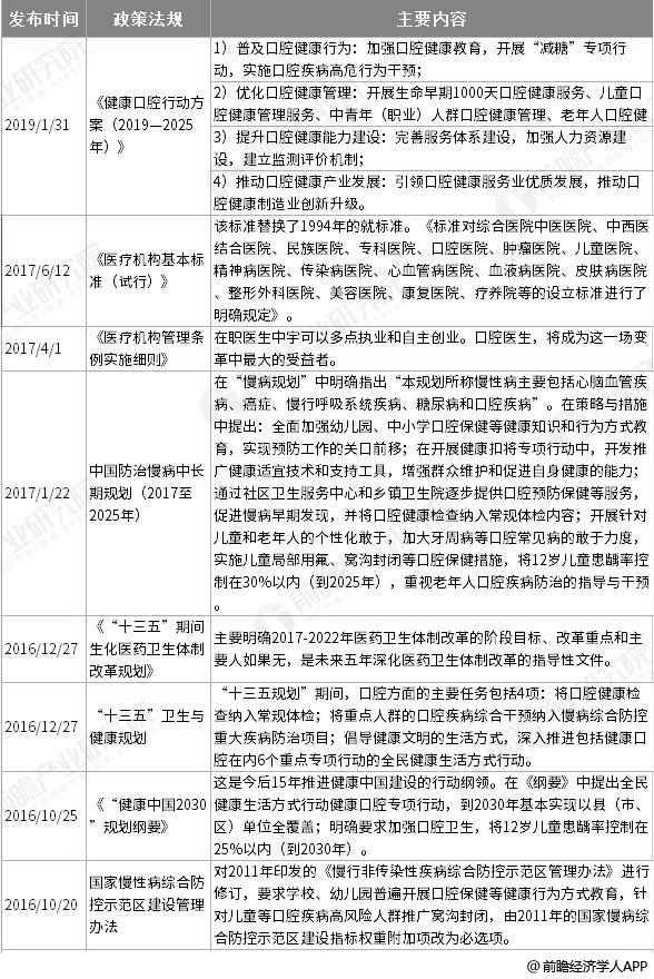 2016年以来中国出台了一系列政策支持口腔医疗行业发展,推动牙医供给改善。2019年1月31日,国家卫生健康委员会发布《健康口腔行动方案(2019—2025年)》,提出不断深入推进“三减三健”健康口腔行动,到2020年12岁儿童龋患率控制在32%以内,2025年12岁儿童龋患率控制在30%以内;