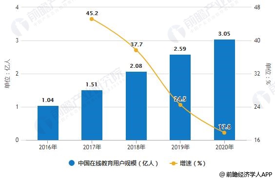 2016-2020年中国在线教育用户规模统计及增长情况预测