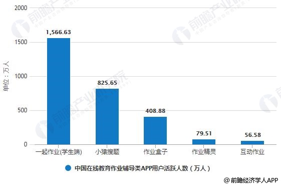 数据显示,在线教育作业辅导类APP中,一起作业(学生端)的活跃人数最高,超过1500万人。一起作业客户端针对小学英语和小学数学两门课程,为学生、家长和在校老师提供在线互动教学服务。