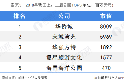 我国上市的主题公园中,总市值位居前列的分别为华侨城、宋城演艺、华强方特和海洋海昌公园,从市值来看,各主题公园差距较大。