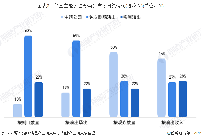 主题公园的演艺剧目吸引力强、收入高。从主题公园的市场份额来看,主题公园演出的剧目数量和演出场次的市场份额仅为10%、19%,但观众数量和演出收入市场份额高达50.1%、45.3%。