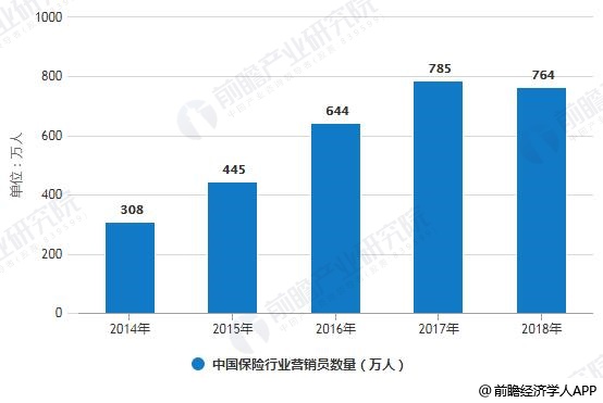 目前,中国保险行业处于行业转型时期,中国保险行业整体增速的下行,影响到保险营销员总数的增长。根据监管机构公布的数据,保险营销员(含代理人)人数2014年、2015年、2016年、2017年底分别为308万人445万人、644万人、785万人。