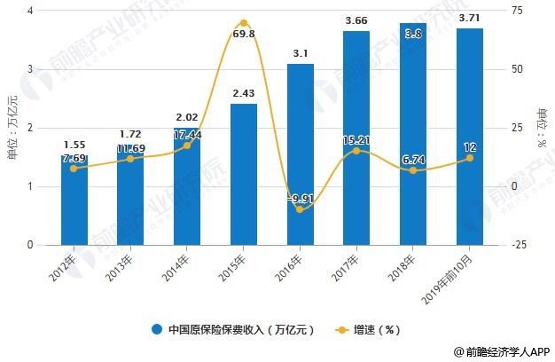 2012-2019年前10月中国原保险保费收入统计及增长情况