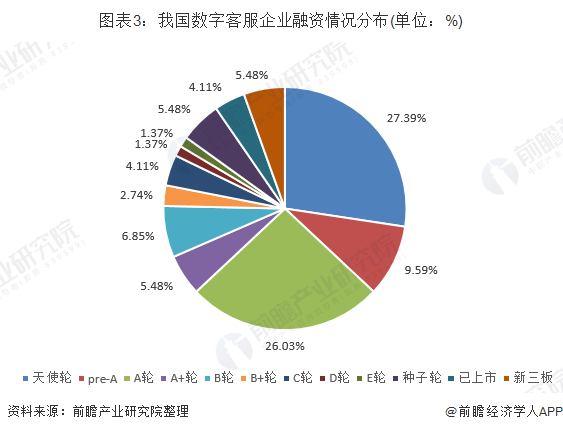 目前,我国企业聊天机器人重点布局客服领域。埃森哲与蚂蚁金服发布《新客服白皮书》显示,目前新客服创新中核心技术之一便是对话机器人。报告显示,大量资本将聊天机器人持续投入智能客服领域。截至2018年12月31日,国内共有73家提供数字客服解决方案的企业获得融资,26.03%的企业获得A轮融资,部分公司融资到C轮以上。