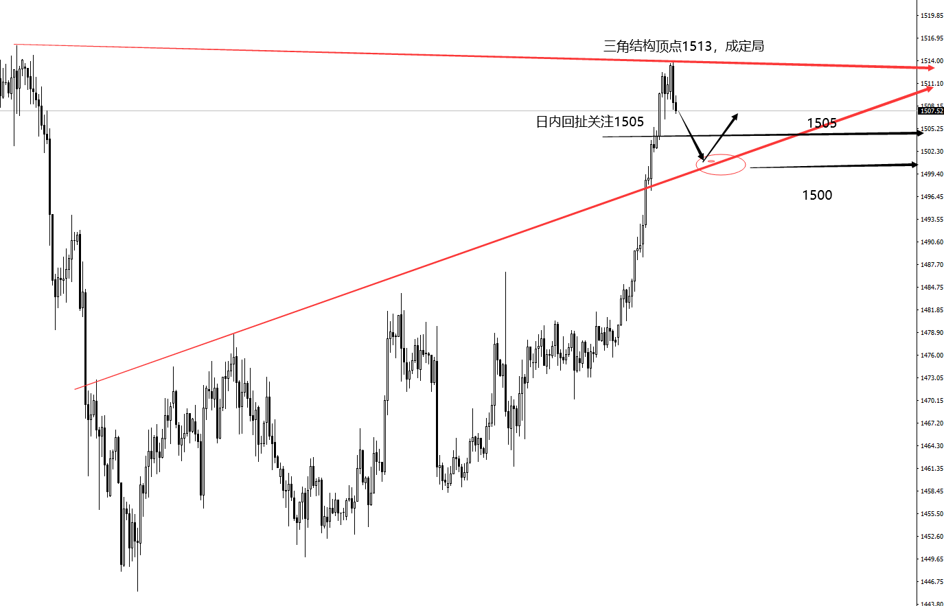 早间的行情走势也印证了我们早上所提到的三角区间顶点位置,行情只能在这个结构区间进行盘整再去调整下一波区间的调整位置,下一步行情的走势中重点关注能否企稳1505一线再去做。此次行情的单边上调基本已经到了顶点,此后必将再会形成一个动荡区间,至于区间的范围我们只能看黄金在哪里构成了支撑点及阻力。