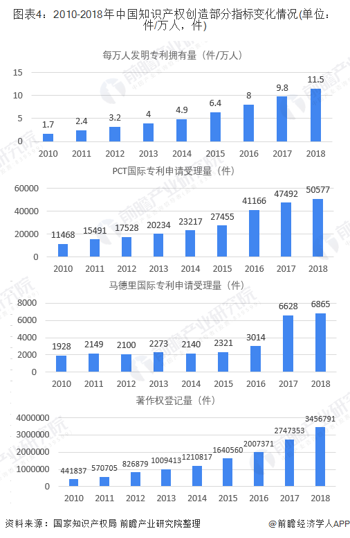 每万人口发明专利拥有量由1.7件提高到11.5件;PCT国际专利申请受理量由1.1万件提高到.1万件;马德里商标国际注册申请量由1928件提高到6865件;著作权登记量由44.2万件提高到345.7万件。