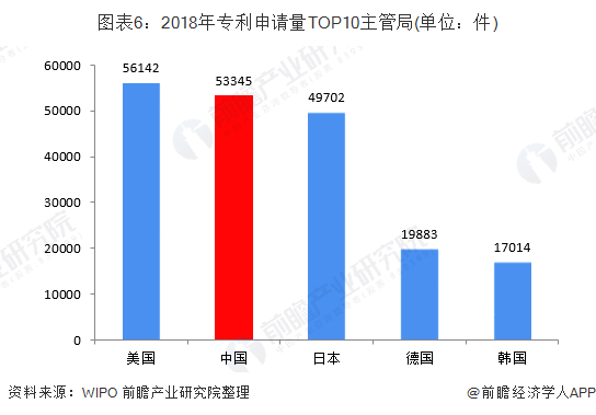 国际专利方面,世界知识产权组织(WIPO)报告显示,2018年提交国际专利申请最多的国家的是美国(56142件),第二名是中国(53345件),第三、第四、第五分别是:日本(49702件)、德国(19883件)、韩国(17014件)。WIPO表示,按照目前的趋势,预计中国将在今后两年内赶超美国。