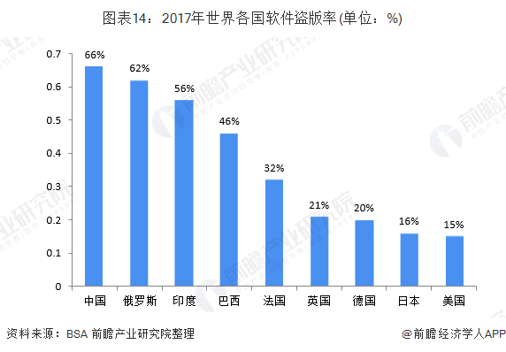 根据BSA整理的数据,中国软件盗版率在2017年为66%,在世界主要国家中处于前列,并比同为发展中国家的巴西高出20%。可见软件盗版在我国十分猖獗,这也给我国软件市场发展带来了非常不利的影响。在控制软件盗版率方面,西方发达国家的平均水平约为20%-25%,如果我国以这一标准作为知识产权市场保护的目标,软件市场将迎来三倍以上的市场空间。