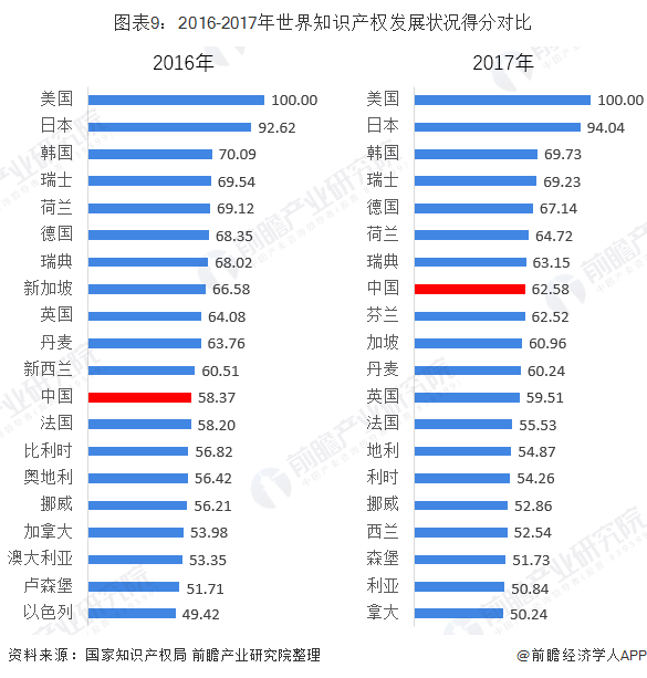国家知识产权局发布的《2018年中国知识产权发展状况评价报告》选取了33个指标,将我国知识产权发展状况与其他国际进行对比。从得分分布上看,与2016年相比,2017年世界知识产权发展状况依然呈现梯队分布,第一梯队美国、日本的总指数得分领先其他样本国家,两国所处优势地位明显;得分大于50的第二梯队国家排名相对稳定,得分与美国、日本的差距在上一年度基础上又有所拉大,我国知识产权发展水平稳居世界中上游,2017年超越丹麦、新西兰、新加坡、芬兰、英国,世界排位由第13位上升至第8位。较之2016年,我国的只是产权发展状况总指数得分从58.2提升至62.58,与知识产权强国的差距继续呈现缩小趋势。