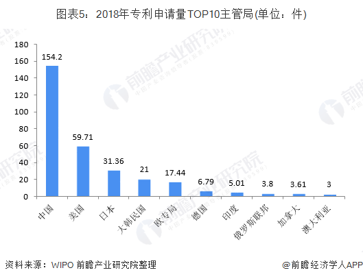 2019年10月16日,世界知识产权组织WIPO发布最新报告,2018年全球创新者共提交了330万件专利申请,其中中国的专利申请量为154万件,占全球46.4%,远超美国的59万件、日本的31万件,连续8年位列世界第一。排在中国局之后的是美国(597141件)、日本(313567件)、大韩民国(209992件)和欧洲专利局(欧专局;174397件)。这五大主管局受理的申请数量共占世界总量的85.3%。