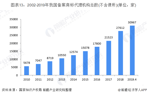 自2002年以来,中国商标代理机构数量一直保持快速增长势头。截至2019年4月底,在商标局备案商标代理机构全国共40431家,其中,代理机构30967家,律所9464家。