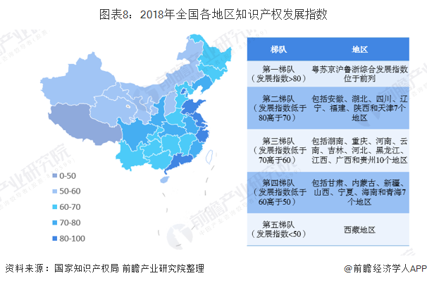2018年全国31个地区只是产权综合发展指数仍呈现阶梯状分布,整体上东部发展优于西部及东北部,中部,东北部及西部部分地区知识产权发展状况明显提升,西部8个地区综合指数低于60,和东部发展优势地区形成明显对比。