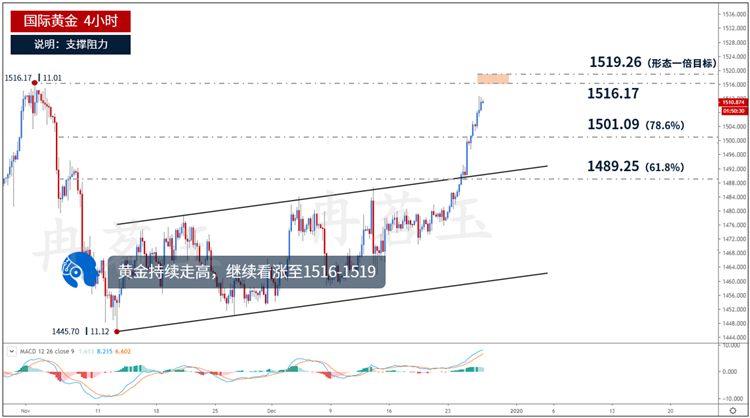 黄金4小时走势,价格突破通道上轨后持续走高,或继续上行至1516-1519。若价格继续上行,上方阻力见由前高与通道形态一倍目标组成的区间1516.17-1519.26。若价格下行,下方支撑位见斐波那契78.6%回调位1501.09,进一步支撑位见通道下轨,接着是斐波那契61.8%回调位1489.25。MACD持续走高,价格突破通道上轨后持续上行,可能继续走高至1516.17-1519.26.(跌破1500失效)