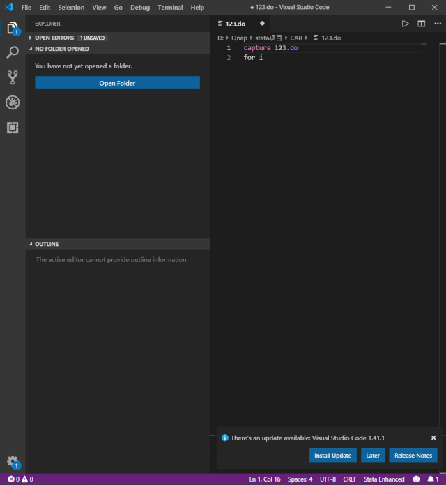 { "code-runner.executorMapByFileExtension":{ ".do":"D:\\Qnap\\stata项目\\vscode编辑stata\\rundo.exe"}, "code-runner.customCommand": "D:\\Qnap\\stata项目\\vscode编辑stata\\rundolines.exe", "stataRun.stataPath": "C:\\Program Files\\Stata16\\StataMP-64.exe", "stataRun.whichApp": "stataMP", "stataRun.pasteSpeed": 1, "stataRun.advancePosition": false,}//high红部分,修改为你自己电脑的rundo.exe、rundolines.exe、StataMP-64.exe路径//只添加键值对,别把{}也给整进去了,最终setting.json外围只有一个{}利用vscode编辑do文件, 按 ctrl+alt+k 组合键 即运行选中代码,按ctrl+alt+n组合键 即运行整个文件。