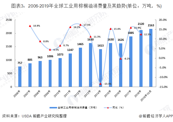 2006-2019年工业用棕榈油消费量一直维持着稳定上升趋势,2018已经到2120万吨,较2017年增长12.5%,截止到2019年10月,全球工业用棕榈油产量为2163万吨。