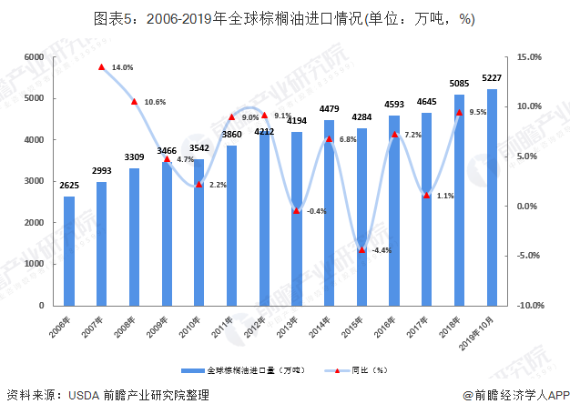 2006-2018年,全球棕榈油进口量呈现不断上升趋势,2018年进口量为5085万吨,截止到2019年10月份,全球棕榈油进口量已经达到5227万吨。