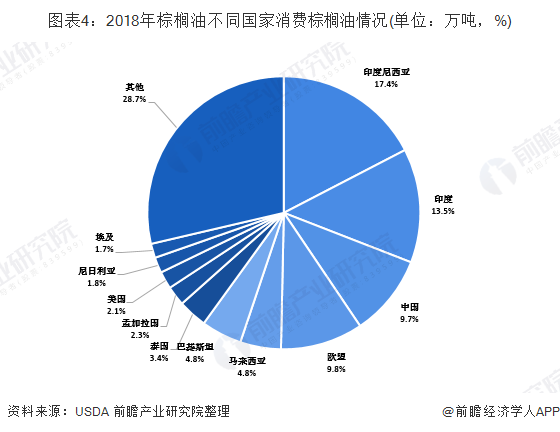 从棕榈油的消费国家来看,印度尼西亚的棕榈油消费量最大,2018年消费了棕榈油1263万吨,占全球消费量的17.4%,其次为印度,消费量为981万吨,占全球比重为14%;第三名为中国,棕榈油消费量为701万吨,占全球比重为9.7%。