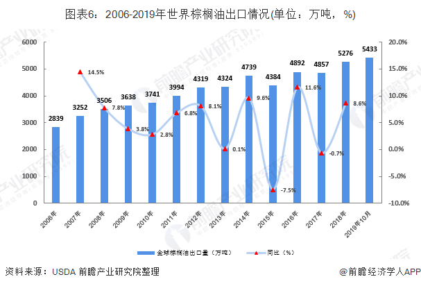 根据美国农业部公布的数据显示,2006-2018年全球棕榈油出口市场稳定增长。2018年全球棕榈油出口量达到5276万吨,较2017年增长8.6%。