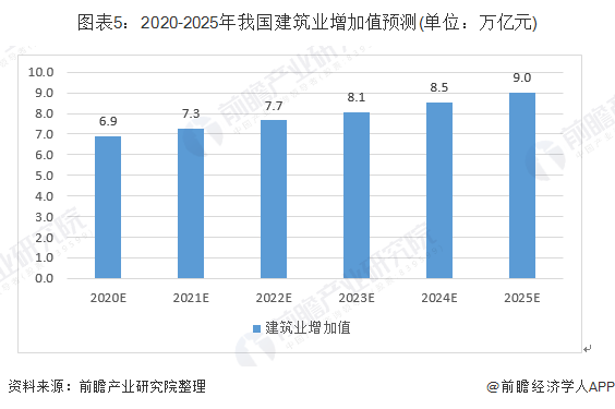 根据《建筑业发展“十三五”规划》提出:以完成全社会固定资产投资建设任务为基础,全国建筑业总产值年均增长7%,建筑业增加值年均增长5.5%;全国工程勘察设计企业营业收入年均增长7%;全国工程监理、造价咨询、招标代理等工程咨询服务企业营业收入年均增长8%;全国建筑企业对外工程承包营业额年均增长6%,进一步巩固建筑业在国民经济中的支柱地位。按照规划速度预测,到2025年,我国建筑业建筑业增加值有望达到9.0万亿元。