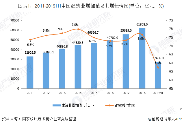 经初步核算,2019年上半年我国国内生产总值450933亿元,按不变价计算比上年同期增长6.3%。2019年上半年,我国建筑业实现增加值27466亿元,按不变价计算比上年同期增长5.5%,增速低于国内生产总值增速0.8个百分点;建筑业增加值占国内生产总值的比例为6.09%。