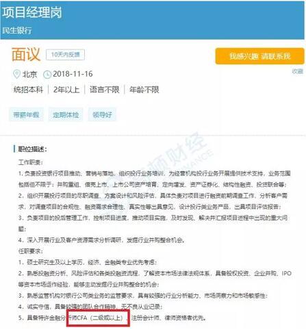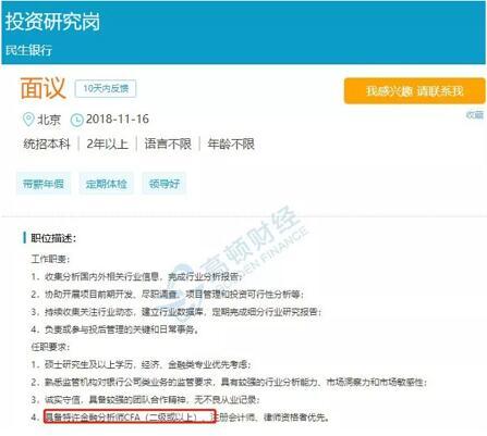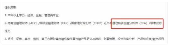 比如之前民生银行的投资研究岗、项目经理岗,任职要求就写明:CFA二级以上优先。