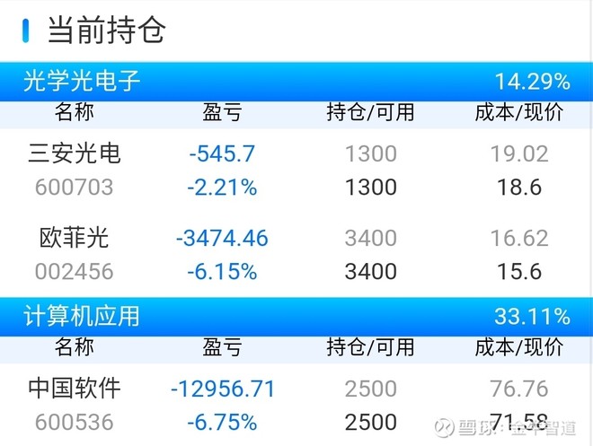 我今天的持仓有三安光电,欧菲光,中国软件。