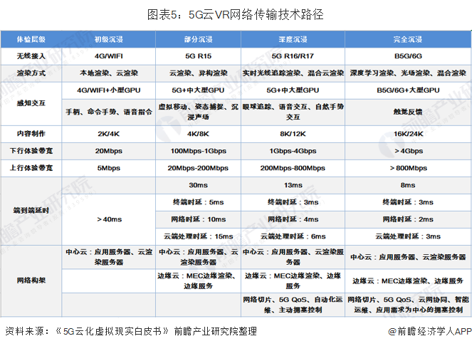VR体验的清晰度和流畅度分别可以通过提升VR内容/终端的分辨率和刷新率来改善,提升以上性能的同时也对网络的带宽和时延也提出了更高的要求。弱交互VR主要是对网络的带宽提出了较高要求;而强交互VR则对网络的带宽和时延等同时提出了较高要求。