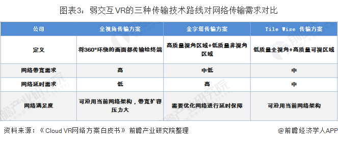 弱交互VR目前的传输方案包括全视角传输和FOV传输两种,前者对带宽的要求更大,强交互VR只有FOV传输一种传输方案。全视角传输方案就是将360度环绕的画面都传输给终端,当用户头部转动需要切换画面时,所有的处理都在终端本地完成。采用全视角传输方案,由于观看者在观看时,实际只能看到当前视野部分,看不到的部分占了网络带宽,但没有真正用到,从而对网络资源造成了较大浪费,因此产业提出了FOV(Field of View,视场角)传输方案,只将高质量视角区域进行传输,不涉及非视角区域。
