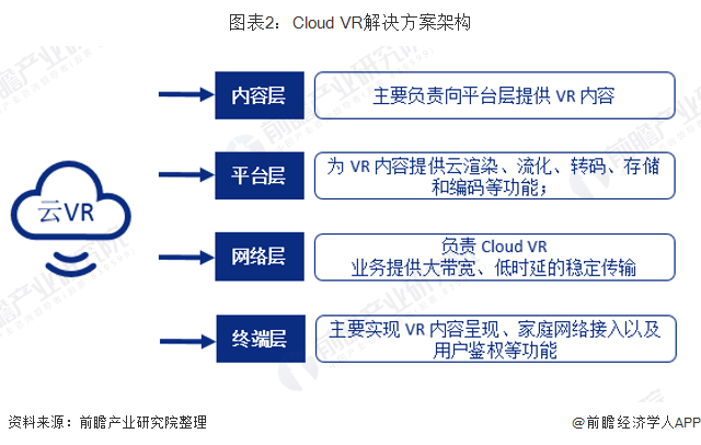 尽管一体机VR设备具备了移动便携的优点,但同时牺牲了运算性能,从而目前的用户体验难以和PC端VR设备相比。为解决这一难题,产业提出了云VR的解决方案,将大量的本地计算移到云端,引入云计算、云渲染技术,并借助高速稳定的网络,将云端的显示输出和声音输出等经过编码压缩后传输到用户的终端设备,从而无需本地主机。
