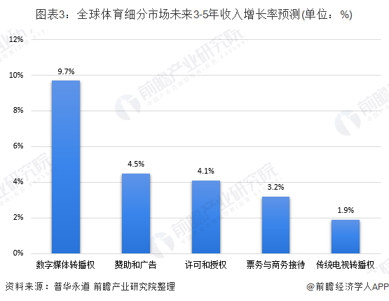 从收入角度来看,数字媒体转播权最被看好,预计未来3-5年,年均收入增长率将达到9.7%,是传统电视转播权(1.9%)的5倍,主要是由于消费行为数字化转型的不断深入而导致的。