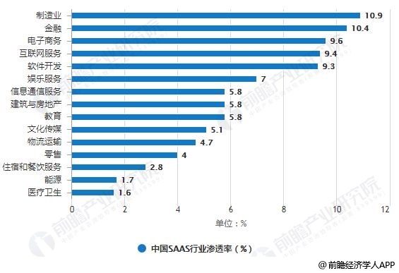 目前,SAAS在各个下游的渗透率还不是很高。分行业来看,制造业、金融、电子商务、互联网服务、软件开发等渗透率相对较高,在10%左右,其中制造业渗透率达10.9%,渗透率相对较高的行业多数与大数据有关,反映出我国SAAS行业“风口”已发生迁移,逐步偏向数字化发展。