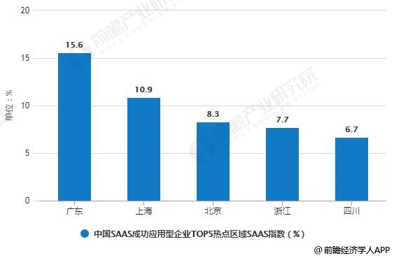 分地区来看,SAAS市场主要分布在华东、华北和华南地区。据阿里云数据显示,2018年,中国SAAS区域市场排行榜的前五位分别为广东、上海、北京、浙江和四川。