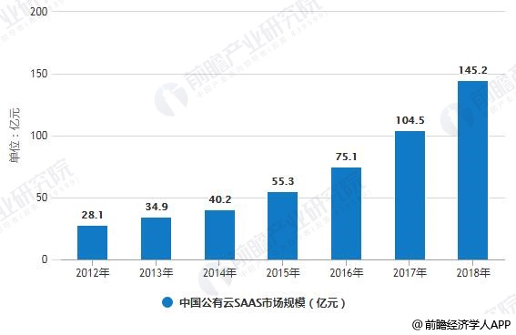 我国SAAS市场已进入高速发展阶段,根据中国信通院统计数据显示,2012年,中国公有云SAAS市场规模仅有28.1亿元,至2018年,中国公有云SAAS市场规模达145.2亿元,较2017年增长38.95%。