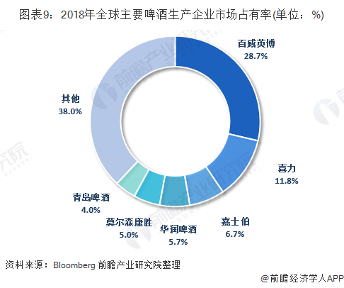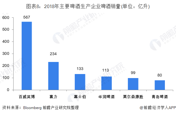 其中百威英博继续保持领先优势,2018年公司营收546亿美元,销量为567亿升,占全球啤酒总消费量的28.7%。