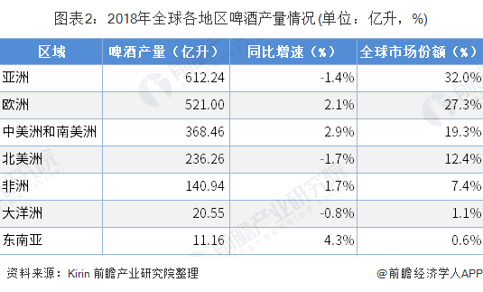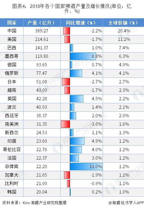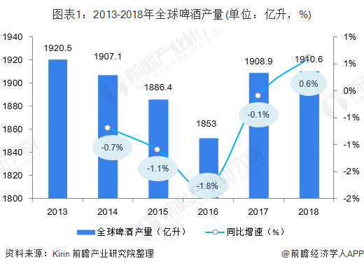 2018年,得益于世界杯赛事,全球啤酒产量达1910.6亿升,较2017年增长了0.6%,这是全球啤酒产量五年来首次增长,增长主要归功于新兴国家如墨西哥、菲律宾等以及俄罗斯做出的贡献。