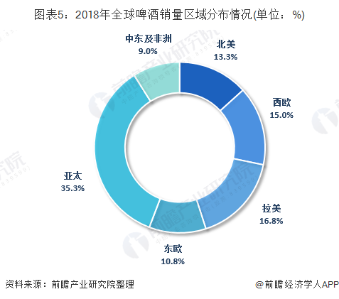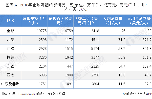 亚太为全球啤酒销量最大的区域,根据Euromonitor统计,2018年亚太地区消费啤酒6895万千升,占全球消费量的35.3%。