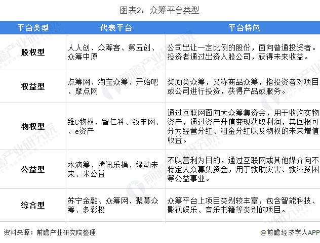 众筹平台按照业务种类的不同可分为以人人创、众筹客为代表的股权型平台,以点筹网、淘宝众筹为代表的权益型平台,以维C物权、智仁科为代表的物权型平台,以水滴筹、腾讯乐捐为代表的公益型平台,和以苏宁金融、众筹网为代表的综合型平台。