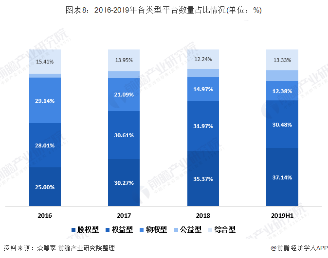 从近年来各类型众筹平台数量占比情况来看,股权型众筹平台发展势头最为迅猛,所占比例逐年增加,在2018年超越权益型平台成为,成为数量最多的平台类型。而物权型平台数量占比逐年下降,从2016年的29.14%下降到2019年的12.38%。